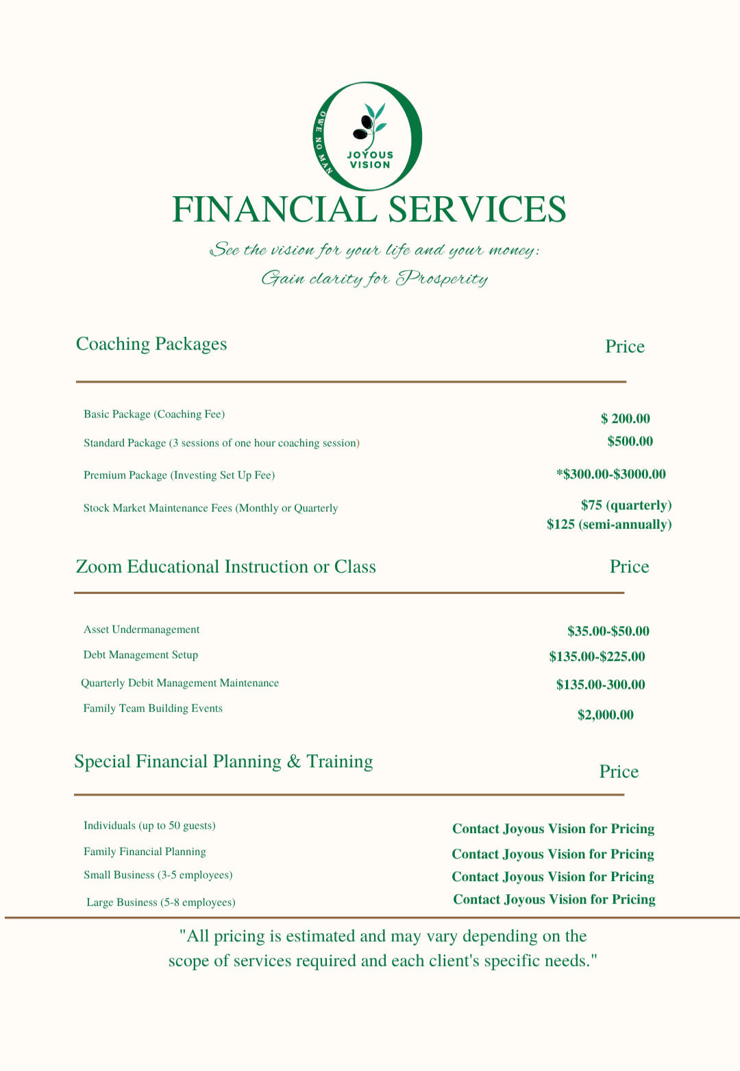 We are thrilled to welcome you to Joyous Vision LLC. where we specialize in Stewardship Development.We are dedicated to empowering individuals like you with the wisdom, vision, blueprint and understanding necessary to achieve their financial goals and secure a stable and prosperous future.